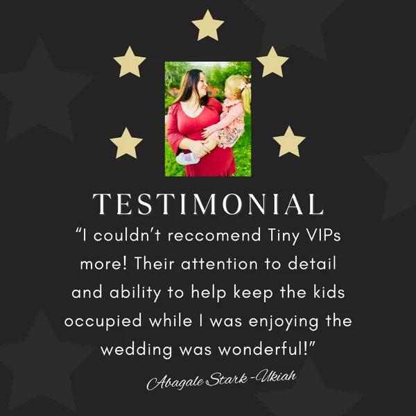 Tiny VIPs provides on-site event childcare so grown-ups can be fully present while little ones feel like honored guests. With over 23 years of experience, our CPR, First Aid, and AED-certified, background-checked teams create a safe, playful space just for kids. From weddings and rehearsal dinners to corporate events and private parties, we bring the crafts, games, and laughs so your Tiny VIPs are happy, engaged, and well cared for, giving you total peace of mind.